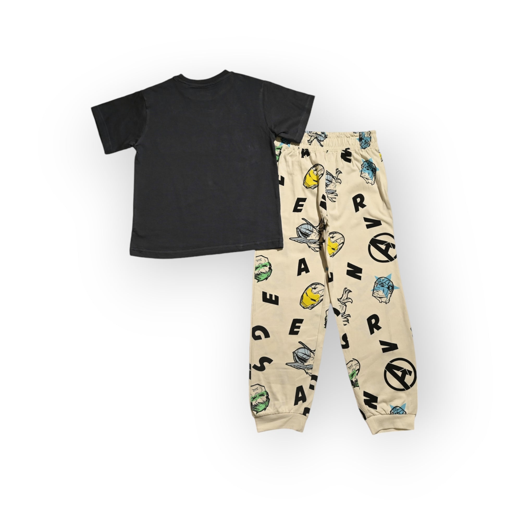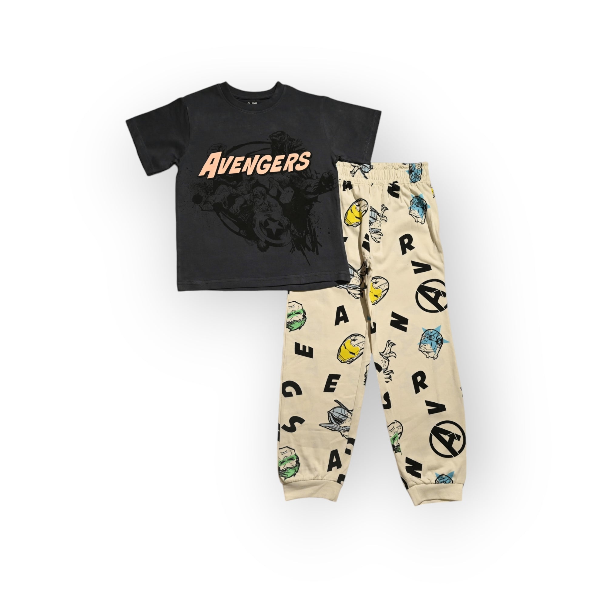 Unleash your inner Avenger with this Marvel-inspired t-shirt and pajama set! The grey t-shirt features a bold graphic of Captain America mid-action, surrounded by iconic Avengers imagery. The white bottom showcase colourful sketches of Avengers masks and logos. This comfy cotton set is perfect for lounging or adventuring. Suit up and channel your superhero spirit! Available in children's sizes.