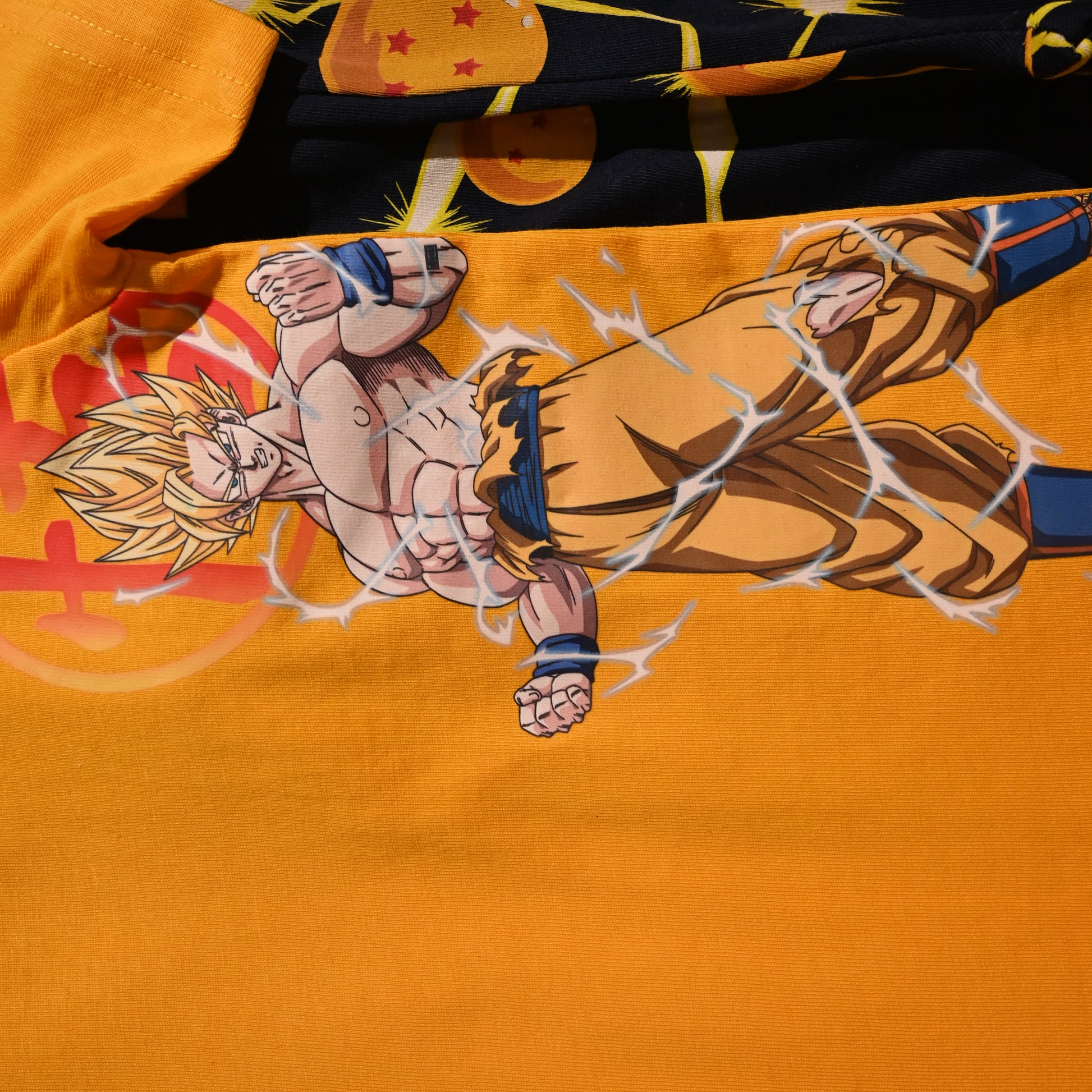Unleash your inner superhero with this vibrant and playful children's outfit! The set features a bright yellow t-shirt adorned with an iconic anime character, exuding power and energy. Pair it with the navy blue pajama, adorned with a whimsical pattern of dandelion seeds, adding a touch of nature's magic. This ensemble is perfect for active play, allowing unrestricted movement and comfort. The high-quality materials ensure durability, while the bold colours and designs inspire imagination and confidence. Let your little one embrace their adventurous spirit and stand out in this eye-catching ensemble.
