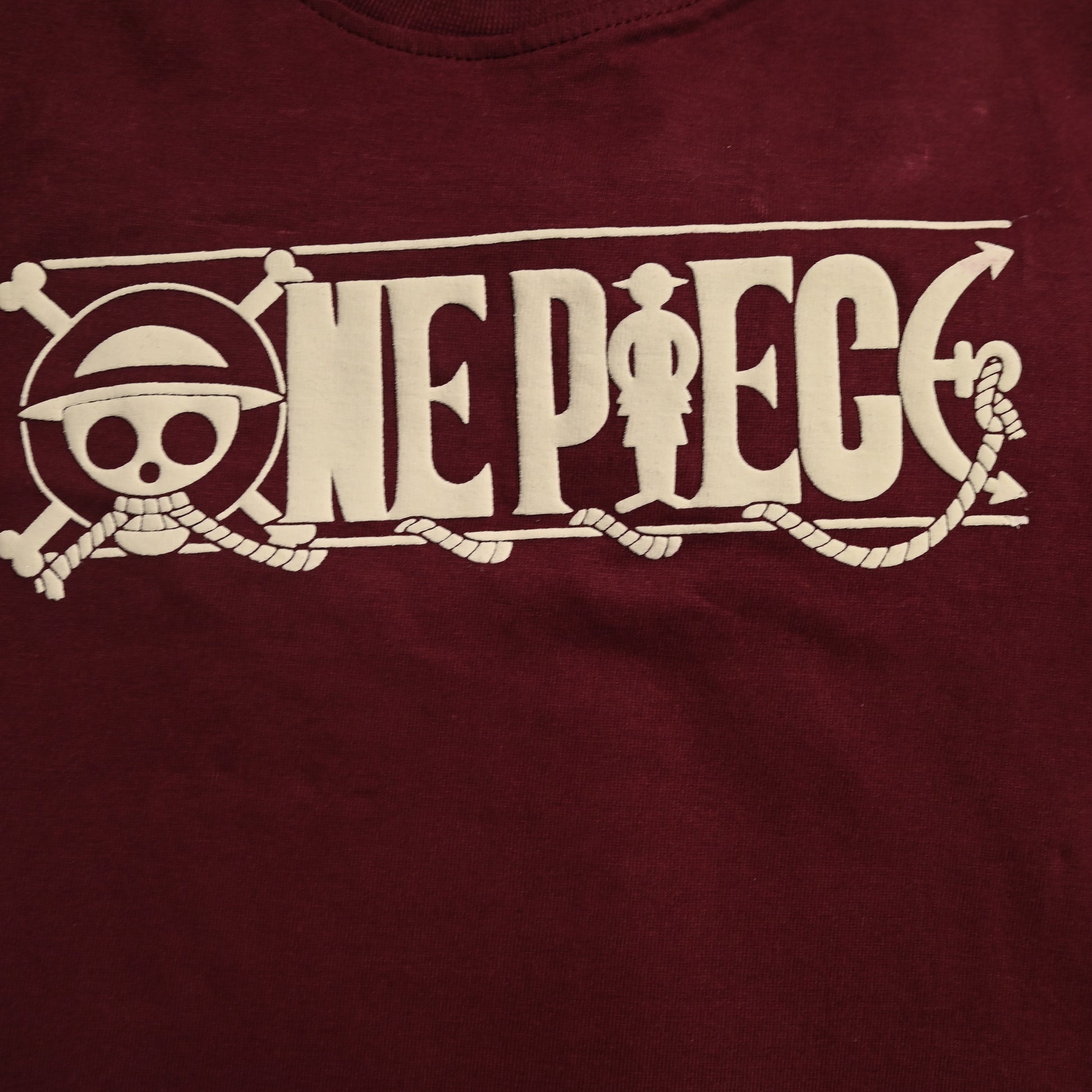 Unleash your inner pirate with this maroon t-shirt featuring the iconic skull and crossbones logo of the anime series 'One Piece'. Made from soft and breathable cotton, this casual tee offers a relaxed fit for all-day comfort. The bold white graphic on the front stands out against the deep burgundy hue, making it a statement piece for any fan. Pair it with shorts or jeans for a laid-back yet stylish look. Please note the sizing and refer to the chart for the perfect fit. Hand wash recommended to maintain vibrancy. Get ready to set sail on your next adventure in this eye-catching One Piece pajama set.