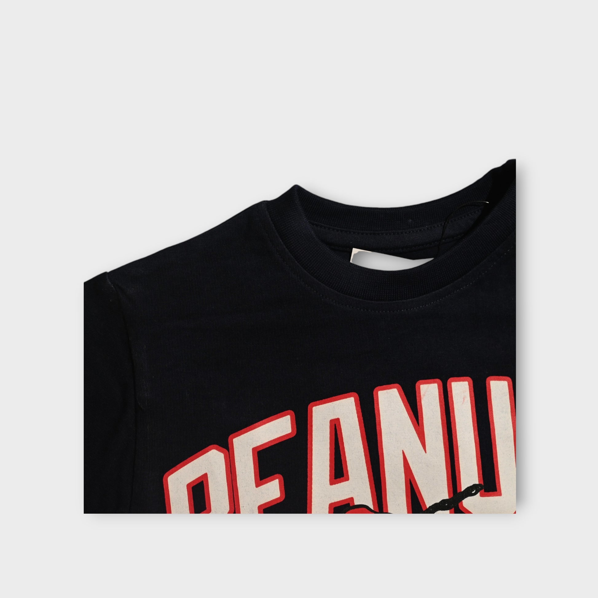 Unleash your inner athlete with this stylish Peanuts-themed athletic wear set. The navy blue T-shirt features the iconic Snoopy character in a baseball stance, accompanied by the bold text 'PEANUTS STRIKE ONE TEAM SNOOPY SINCE 1950'. The red shorts showcase the Peanuts logo and 'Athletic Department' text in a repeating pattern, adding a touch of sporty flair. This comfortable set is perfect for workouts, lounging, or showing your love for the beloved Peanuts gang. With its vibrant colours and classic design, this outfit is sure to turn heads and bring a smile to any Peanuts enthusiast's face. Embrace your active lifestyle while paying homage to a timeless comic strip.