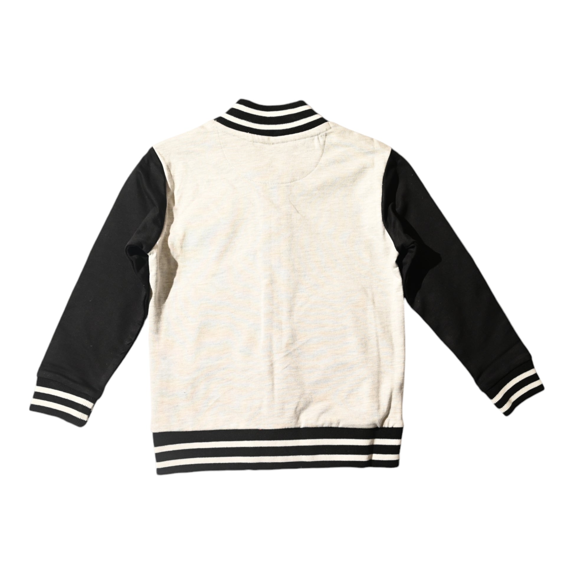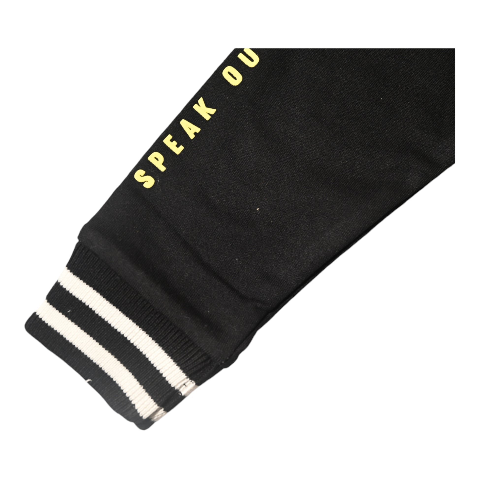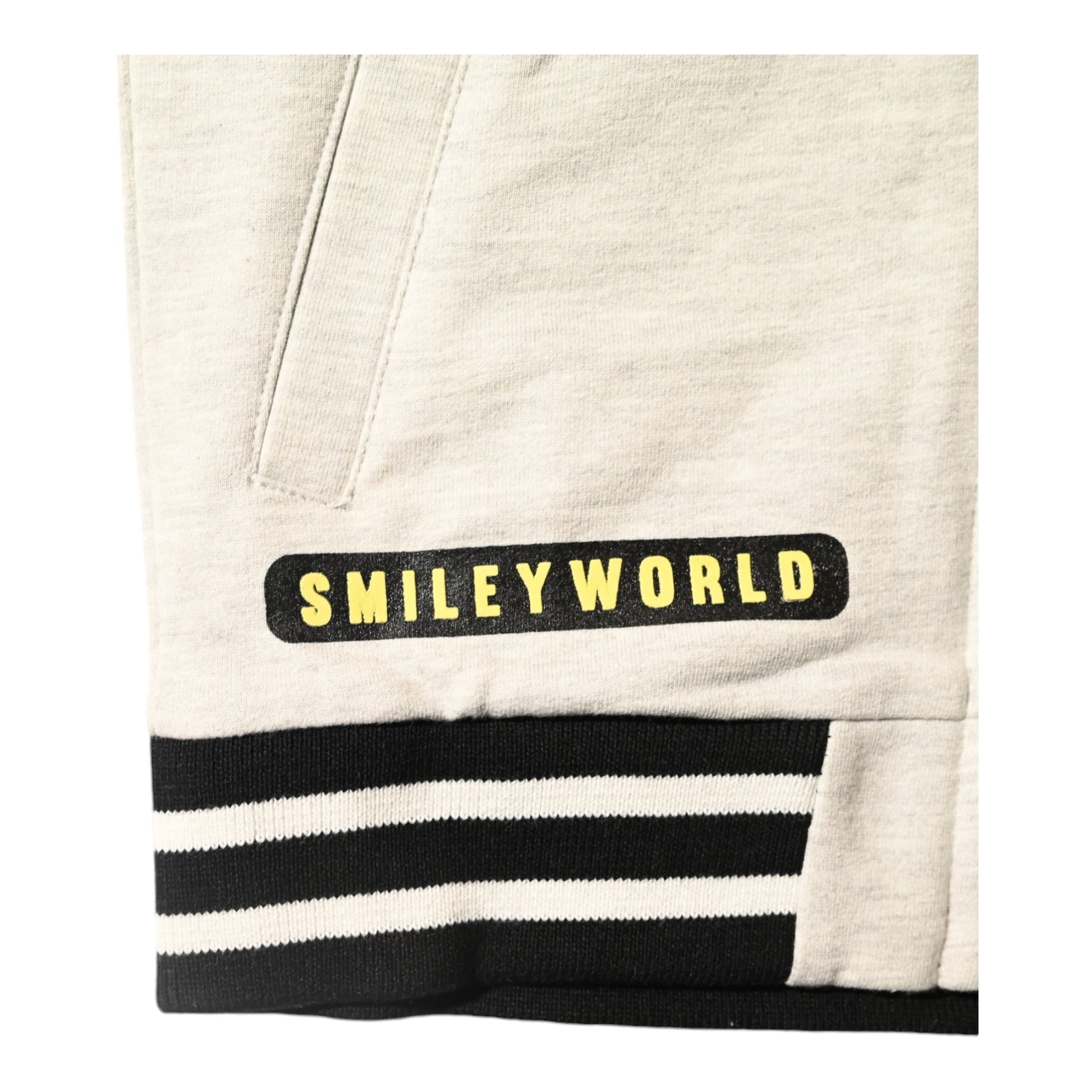 Embrace positivity and spread smiles with this trendy zip-up jacket. Crafted with a blend of comfort and style, it features a vibrant yellow smiley face emblem on the front, contrasting black sleeves, and white body. The jacket's relaxed fit and striped detailing on the sleeves and hem add a sporty touch. Perfect for casual outings or lounging at home, this versatile piece will uplift your mood and encourage happiness wherever you go. With its playful design and cosy fabric, it's a must-have for anyone seeking a fashionable way to spread joy. Pair it with your favourite jeans or joggers for a laidback yet upbeat look.